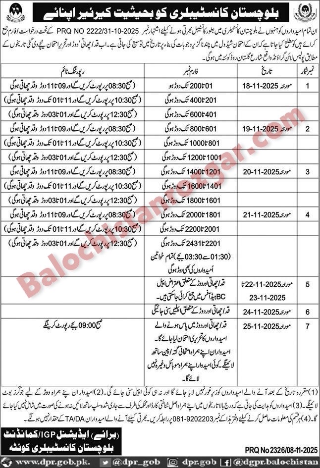 Balochistan Constabulary BC Police Physical and written Test Schedule 2025