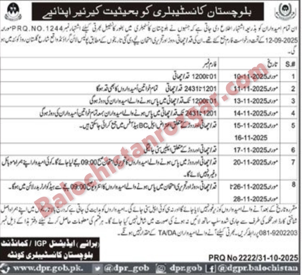 Balochistan Constabulary BC Police Written Test Schedule 2025 Full Time