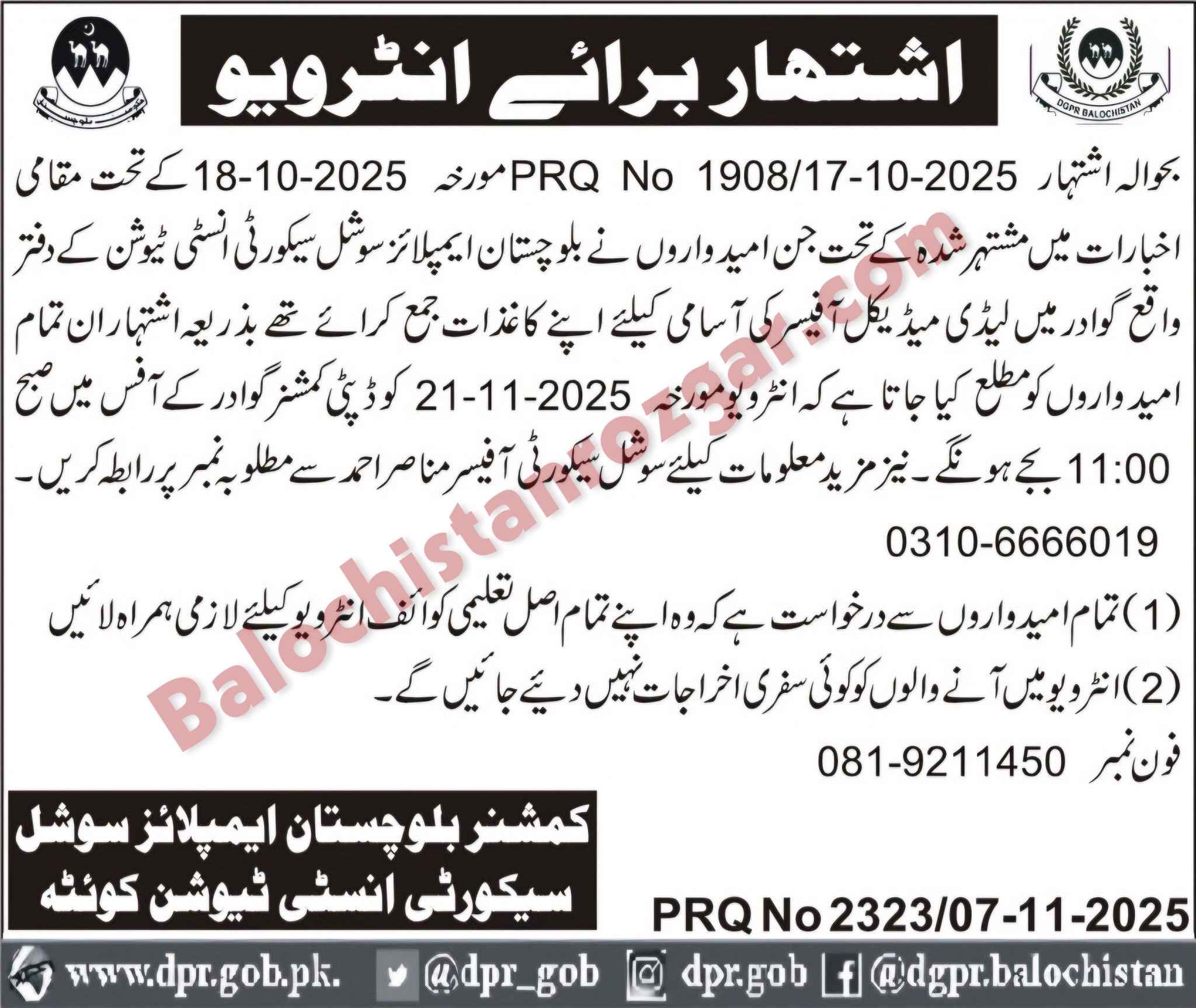 Balochistan employees Social Security Institution Quetta has scheduled Interview for their vacant post which was published in newspaper. Those candidates From Balochistan who applied for these Balochistan employees Social Security Institution Quetta jobs are informed that their Interview Shall be conducted on the following schedule below.