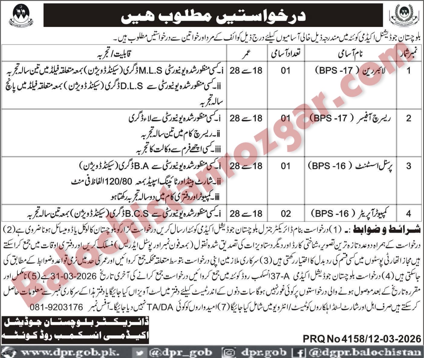This is the best opportunity for eligible and professional candidates to apply for these Balochistan Judicial Academy Quetta jobs 2026. Department offering Following job vacancies In Balochistan. These jobs were announced Jang Newspaper. we have taken the job advertisement there. The Both male and female candidates are eligible to apply for these Balochistan Judicial Academy Quetta Jobs 2026. Candidates who meet the qualification and experience requirements can apply for these jobs. Application procedure for these jobs is defined below, and interested candidates are advised to apply before the closing date after the deadline of the post no application shall be entertained.