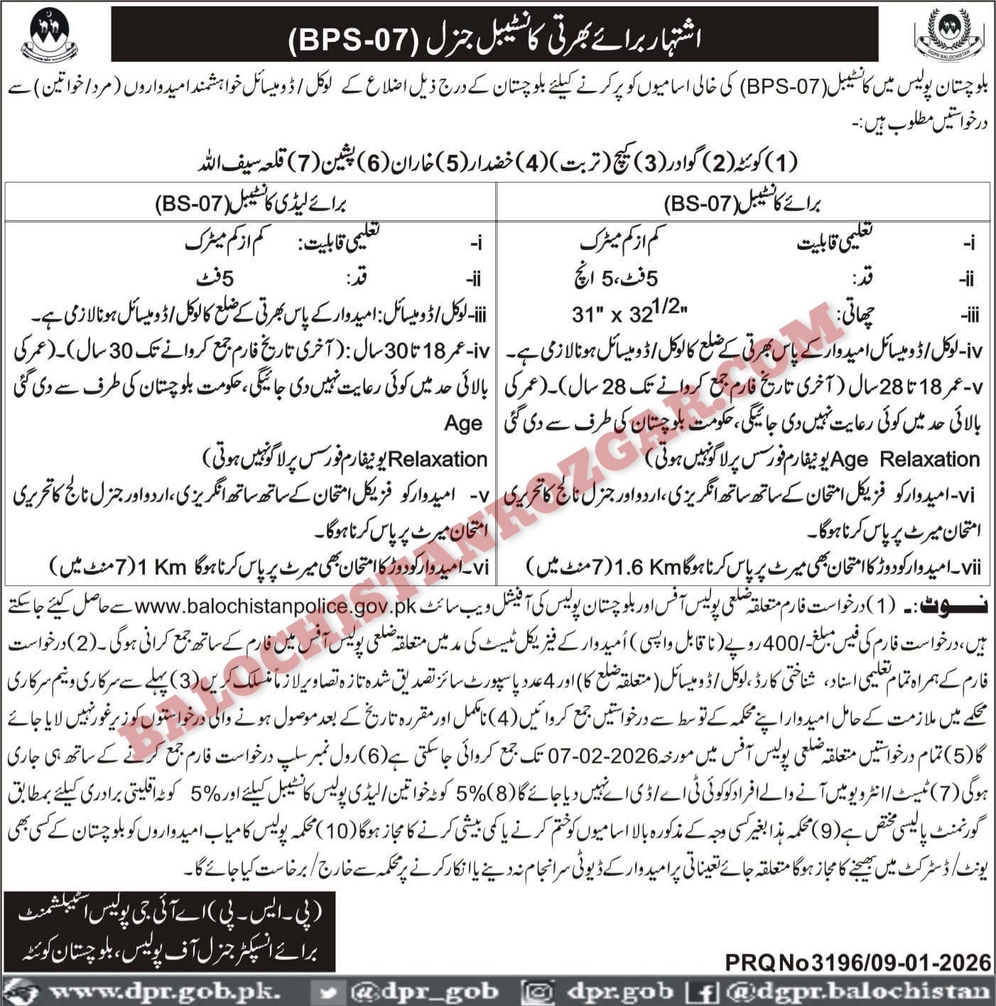 The deadline to submit applications for Balochistan Police Jobs 2026 is 07 FEB 2026. It is important to apply before this date, as no applications will be accepted after the deadline. Any applications received after this date will be rejected, so be sure to submit yours on time! Don’t miss out on this opportunity.