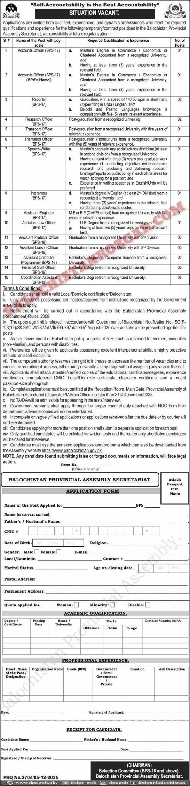 The deadline to submit applications for Balochistan Provincial Assembly Secretriat Jobs 2025 is 31 Dec 2025. It is important to apply before this date, as no applications will be accepted after the deadline. Any applications received after this date will be rejected, so be sure to submit yours on time! Don’t miss out on this opportunity.