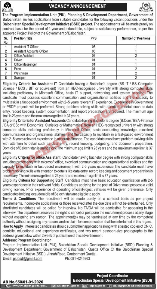 The deadline to submit applications for Balochistan Special Development Initiative BSDI Project Jobs 2025 is 15 Jan 2026. It is important to apply before this date, as no applications will be accepted after the deadline. Any applications received after this date will be rejected, so be sure to submit yours on time! Don’t miss out on this opportunity.