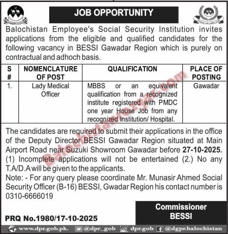 The deadline to submit applications for Baluchistan Employees Social Security Institution BESI Jobs 2025 is 27 October 2025. It is important to apply before this date, as no applications will be accepted after the deadline. Any applications received after this date will be rejected, so be sure to submit yours on time! Don’t miss out on this opportunity.