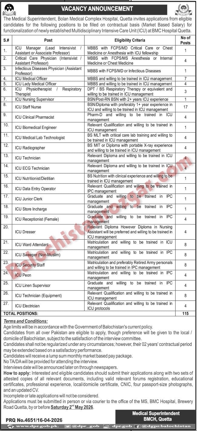 Applications must be submitted in person or via courier to the office of the MS, BMC Hospital, Brewery Road Quetta, by or before Saturday 2®May 2026.