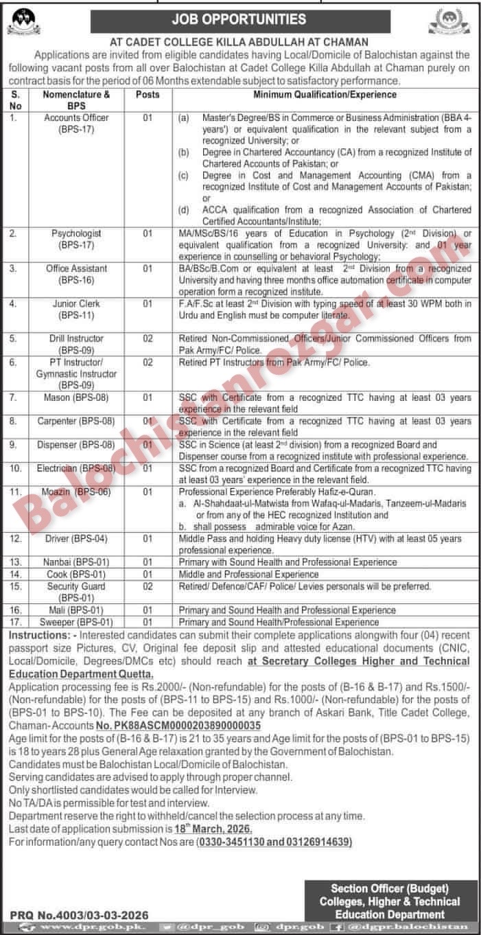 Cadet College Killa Abdullah Jobs 2026 has recently announced job vacancies for Balochistan Locals. These Vacancies were announce in today’s local newspaper. This is an opportunity for candidates of Balochistan Local Domicile holders who seeking employment in Killa Abdullah. Candidates from balochistan can now apply for the following jobs vacant (Candidates who fulfill the criteria can apply) It’s good to read the advertisement first Like Jobs Eligibility Criteria, Current Job Qualification Requirements and Education details for the Post which candidates are willing applying. For the following vacants the Concerned department is inviting applications from the candidates of Balochistan for the following Cadet College Killa Abdullah 2026 jobs. If you meet the eligibility criteria and possess and other skills (if any) then you may apply.