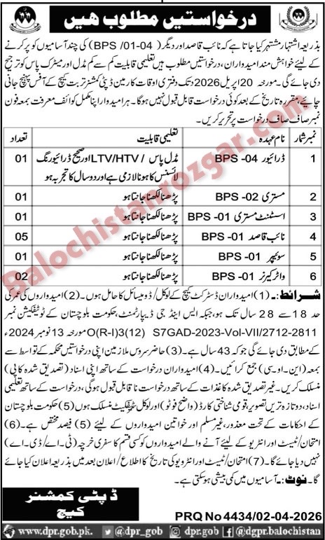 Deputy Commissioner DC kech Jobs 2026 has recently announced job vacancies for kech Locals. These Vacancies were announce in today’s local newspaper. This is an opportunity for candidates of kech Local Domicile holders who seeking employment in kech. Candidates from kech can now apply for the following jobs vacant (Candidates who fulfill the criteria can apply) It’s good to read the advertisement first Like Jobs Eligibility Criteria, Current Job Qualification Requirements and Education details for the Post which candidates are willing applying. For the following vacants the Concerned department is inviting applications from the candidates of Balochistan for the following Deputy Commissioner DC kech 2026 jobs. If you meet the eligibility criteria and possess and other skills (if any) then you may apply.