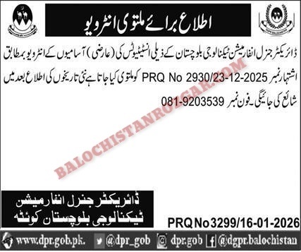 Directorate General Information Technology Balochistan has scheduled Interview for their vacant post which was published in newspaper. Those candidates From Balochistan who applied for these Directorate General Information Technology Balochistan vacant jobs are informed that their Interview Shall be conducted on the following schedule below.