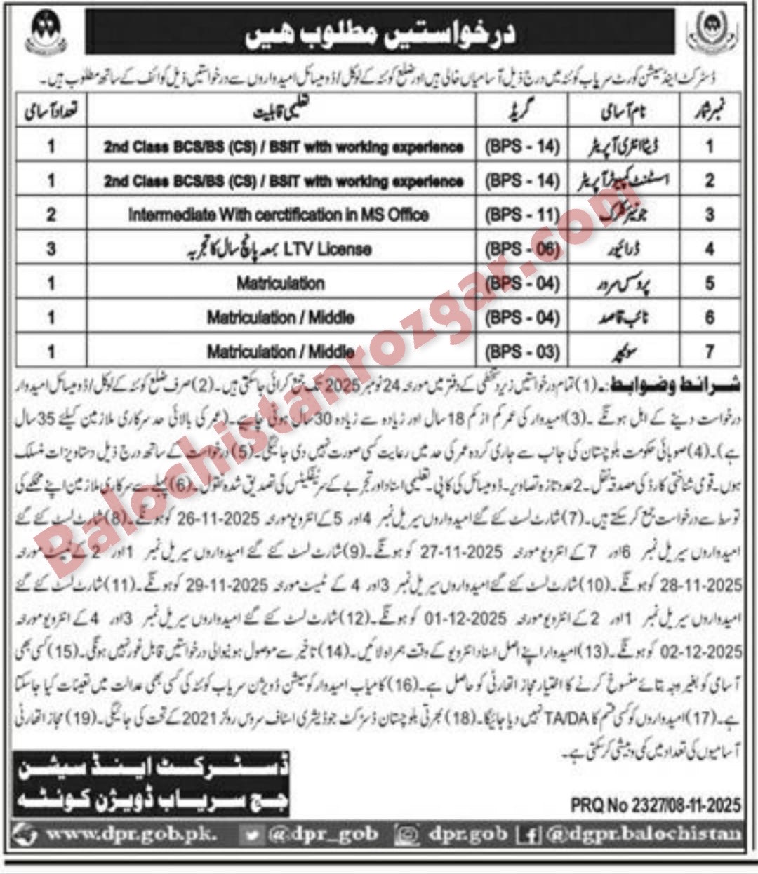 The deadline to submit applications for District and Session Court Quetta Jobs 2025 is 24 November 2025. It is important to apply before this date, as no applications will be accepted after the deadline. Any applications received after this date will be rejected, so be sure to submit yours on time! Don’t miss out on this opportunity.