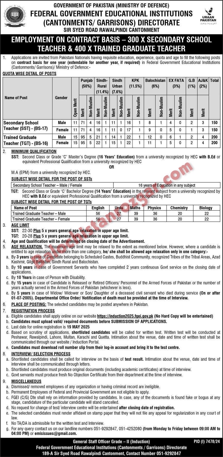 The deadline to submit applications for Federal Government Educational Institutions FDEI Jobs 2025 is 19 May 2025. It is important to apply before this date, as no applications will be accepted after the deadline. Any applications received after this date will be rejected, so be sure to submit yours on time! Don’t miss out on this opportunity.
