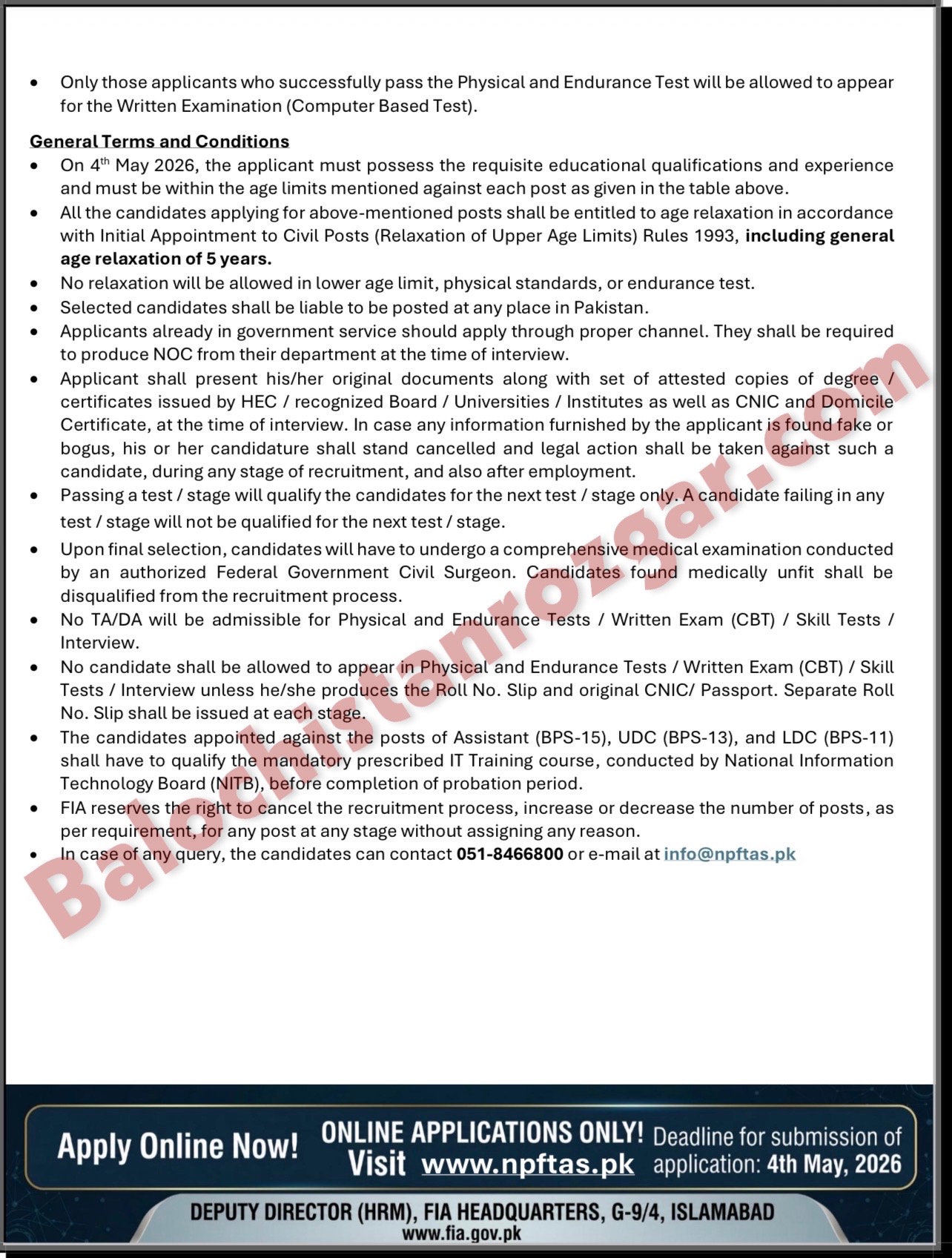 The deadline to submit applications for Federal Investigation Agency FIA Balochistan Jobs 2026 is 04 May 2026. It is important to apply before this date, as no applications will be accepted after the deadline. Any applications received after this date will be rejected, so be sure to submit yours on time! Don’t miss out on this opportunity.