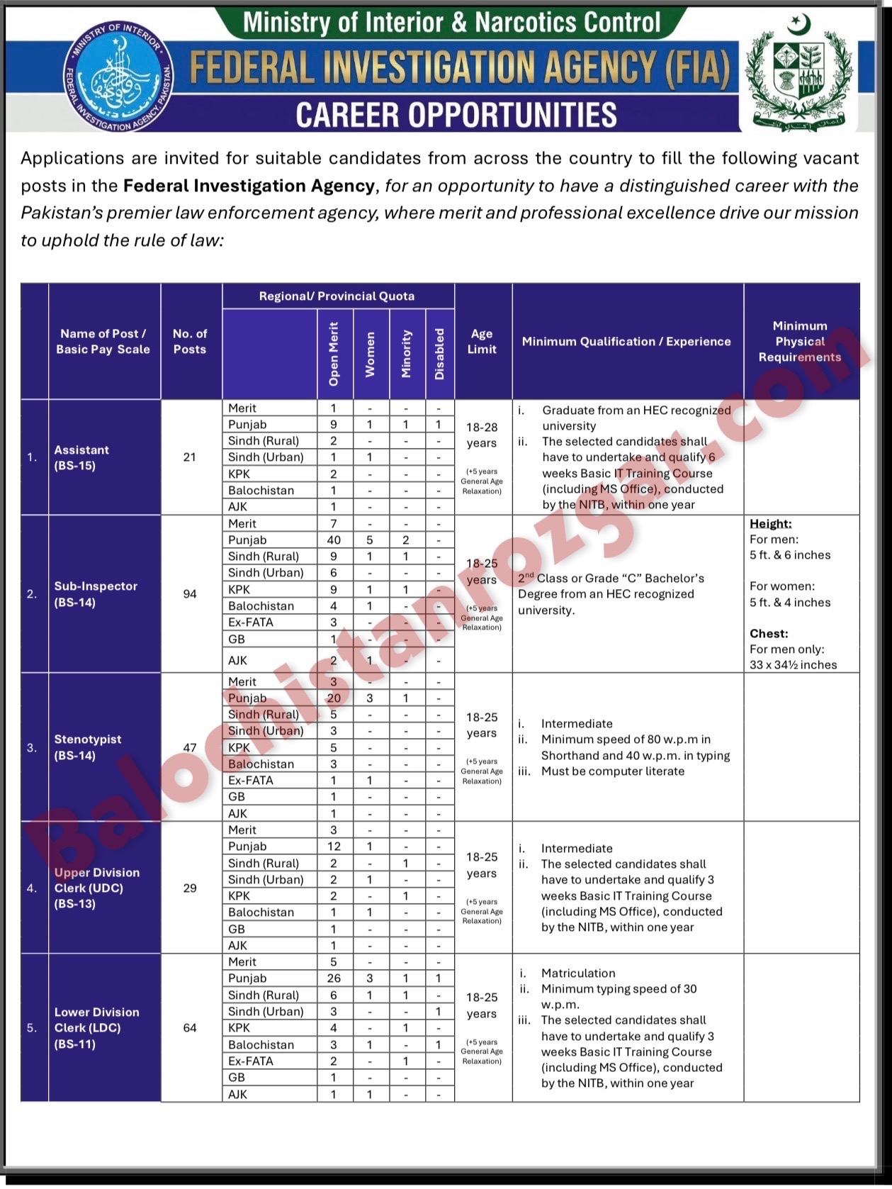 Federal Investigation Agency FIA Balochistan Jobs 2026 has recently announced job vacancies for Balochistan Locals. These Vacancies were announce in today’s local newspaper. This is an opportunity for candidates of Balochistan Local Domicile holders who seeking employment in Balochistan. Candidates from balochistan can now apply for the following jobs vacant (Candidates who fulfill the criteria can apply) It’s good to read the advertisement first Like Jobs Eligibility Criteria, Current Job Qualification Requirements and Education details for the Post which candidates are willing applying. For the following vacants the Concerned department is inviting applications from the candidates of Balochistan for the following Federal Investigation Agency FIA Balochistan 2026 jobs. If you meet the eligibility criteria and possess and other skills (if any) then you may apply.