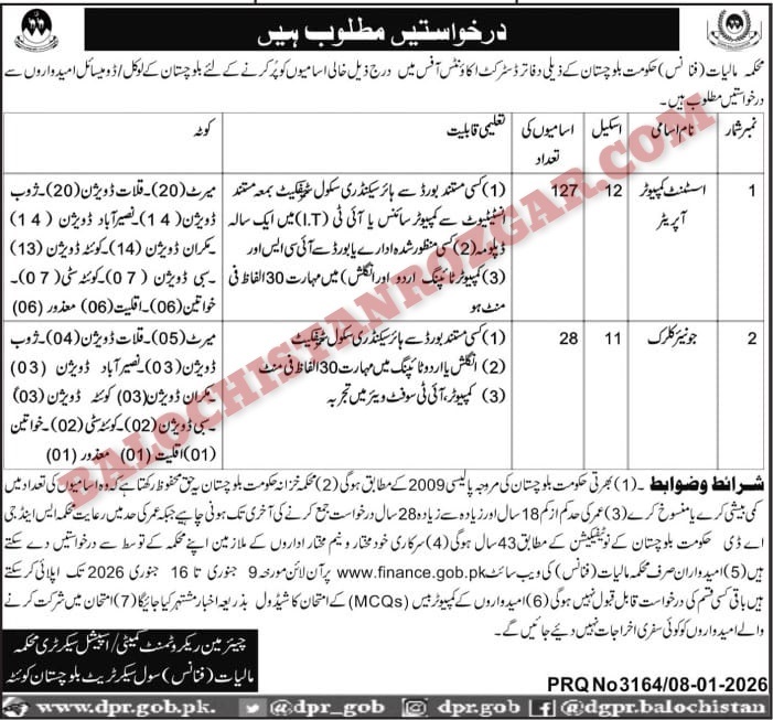 Finance Department Balochistan Jobs 2026 has recently announced job vacancies for Balochistan Locals. These Vacancies were announce in today’s local newspaper. This is an opportunity for candidates of Balochistan Local Domicile holders who seeking employment in Balochistan. Candidates from balochistan can now apply for the following jobs vacant (Candidates who fulfill the criteria can apply) It’s good to read the advertisement first Like Jobs Eligibility Criteria, Current Job Qualification Requirements and Education details for the Post which candidates are willing applying. For the following vacants the Concerned department is inviting applications from the candidates of Balochistan for the following Finance Department Balochistan 2026 jobs. If you meet the eligibility criteria and possess and other skills (if any) then you may apply.