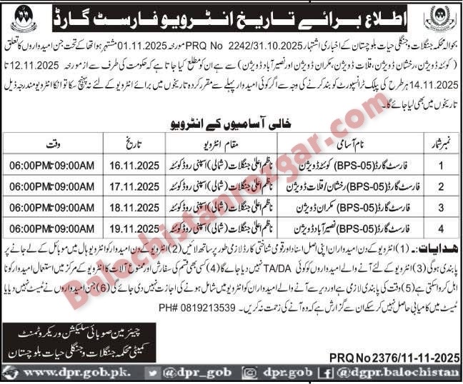 Forest Department Balochistan Forest Guard Jobs Interview 2025 NEW