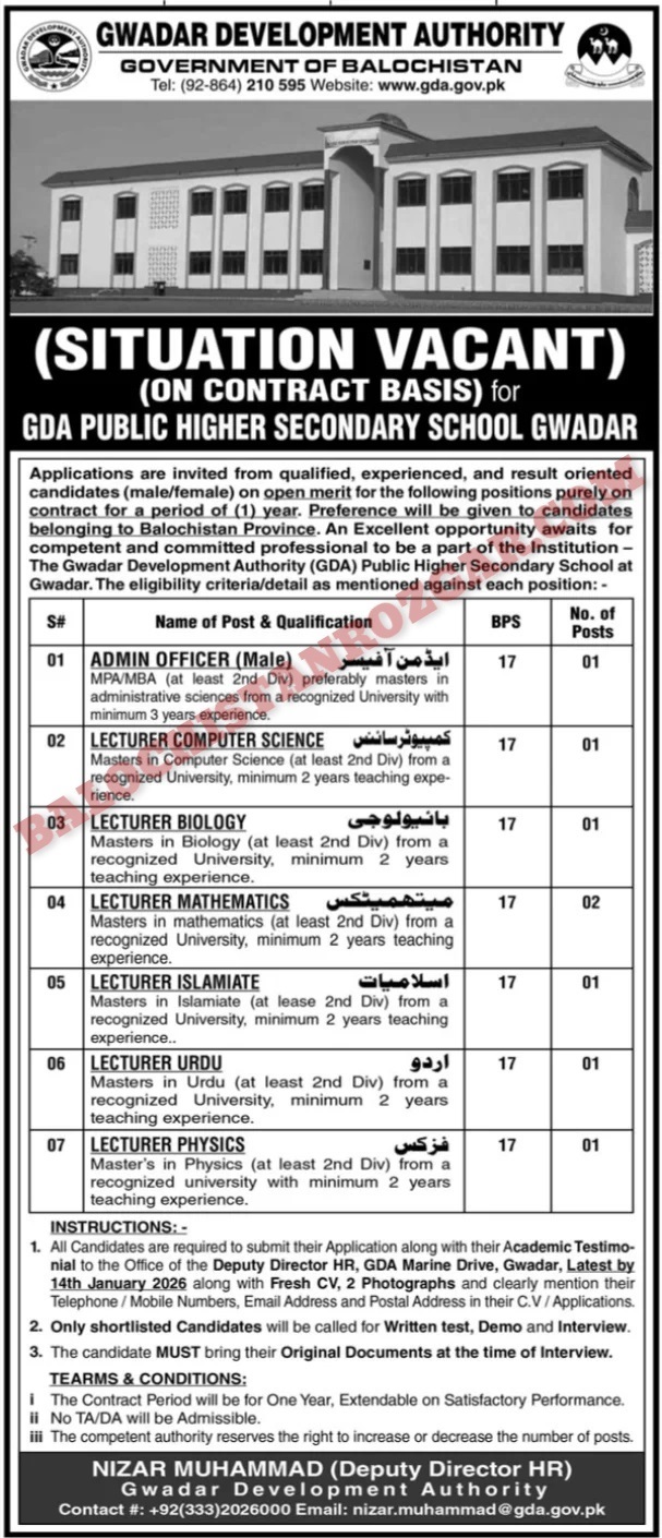 The deadline to submit applications for GDA Public Higher Secondary School Gwadar Jobs 2026 is 14 Jan 2026. It is important to apply before this date, as no applications will be accepted after the deadline. Any applications received after this date will be rejected, so be sure to submit yours on time! Don’t miss out on this opportunity.