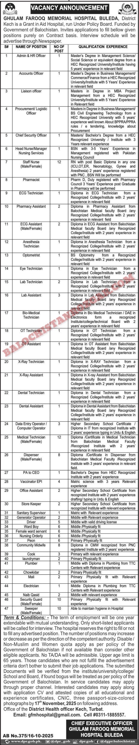 Ghulam Farooq Memorial Hospital Buleda Jobs 2025 Full Time NEW
