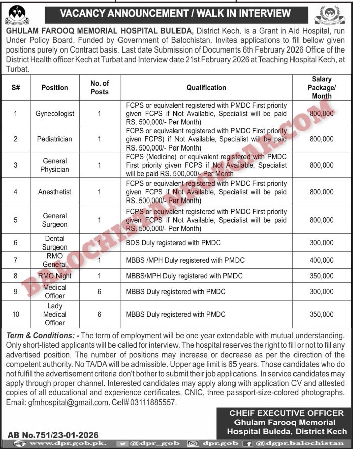 The deadline to submit applications for Ghulam Farooq Memorial Hospital Buleda Kech Jobs 2026 is 06 Feb 2026. It is important to apply before this date, as no applications will be accepted after the deadline. Any applications received after this date will be rejected, so be sure to submit yours on time! Don’t miss out on this opportunity.