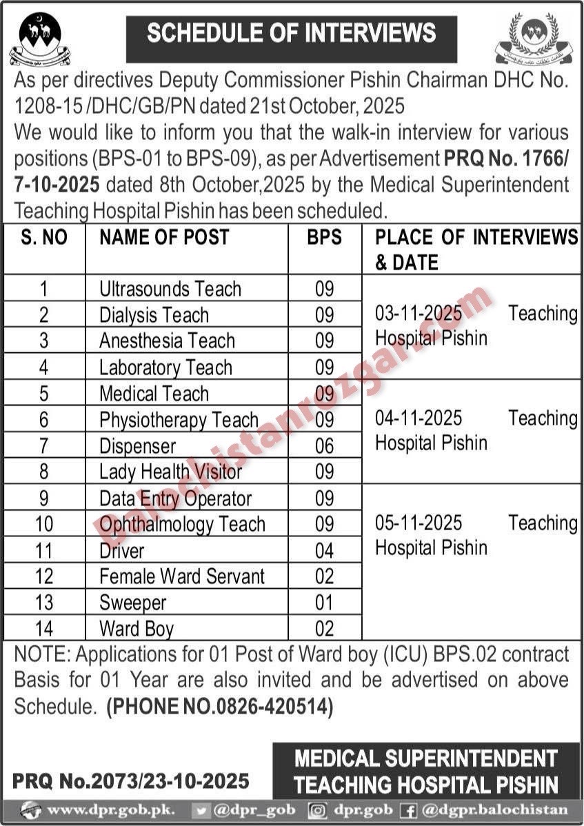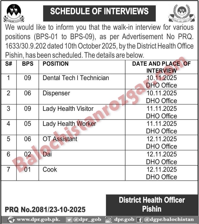 Health Department Pishin has scheduled Interview for their vacant post which was published in newspaper. Those candidates From Pishin who applied for these Health Department Pishin jobs are informed that their Interview Shall be conducted on the following schedule below.