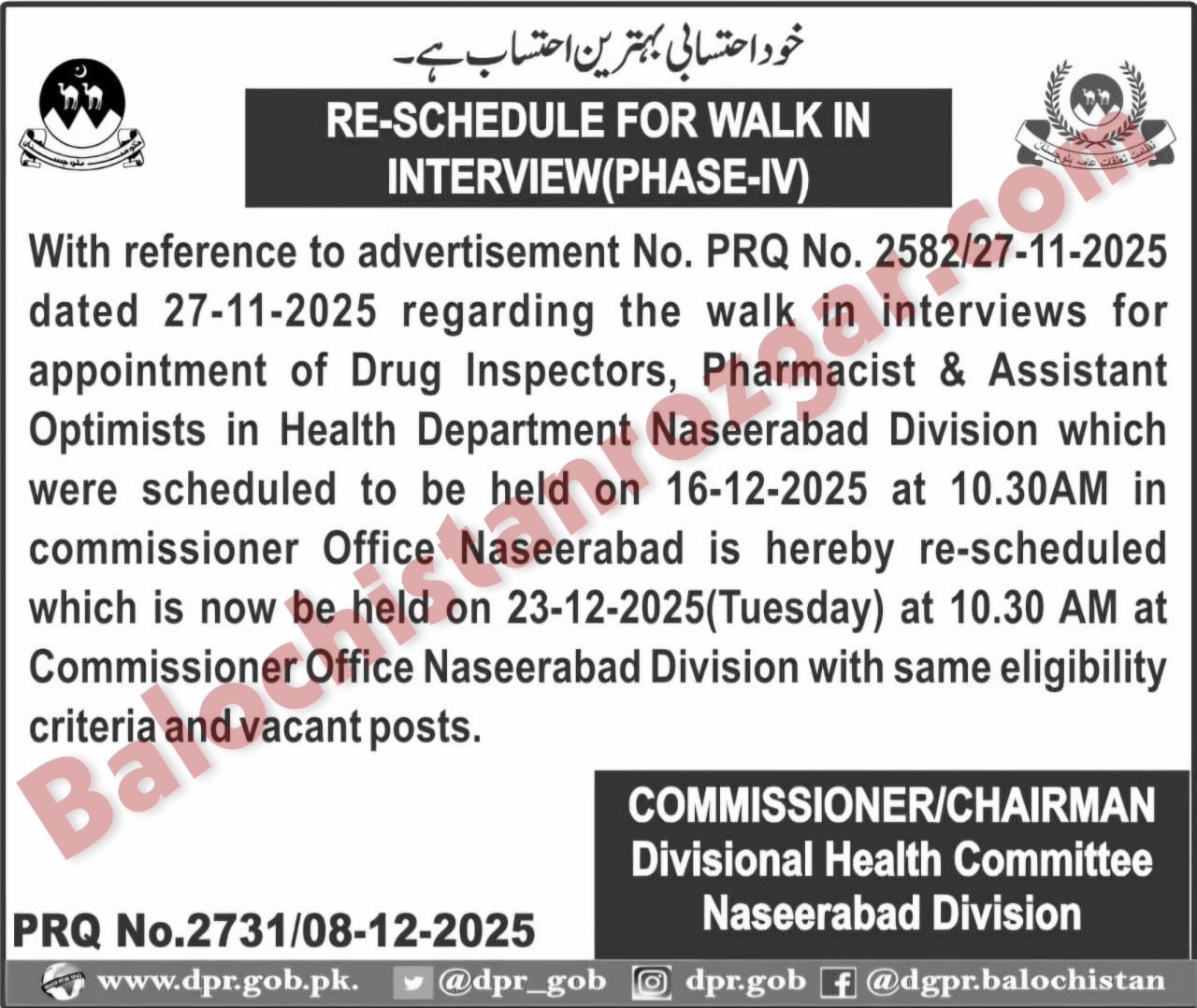 Health Services Naseerabad Division has scheduled Interview for their vacant post which was published in newspaper. Those candidates From Balochistan who applied for these Health Services Naseerabad Division vacant jobs are informed that their Interview Shall be conducted on the following schedule below.