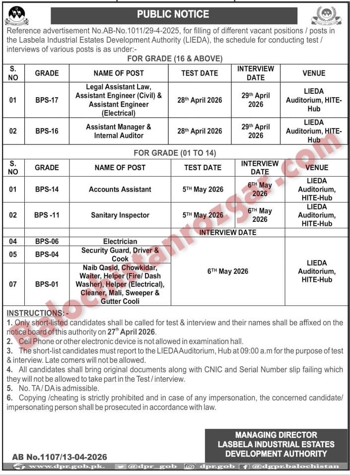 Lasbela Industrial Estate Development Authority LIEDA Test Interview 2026 NEW