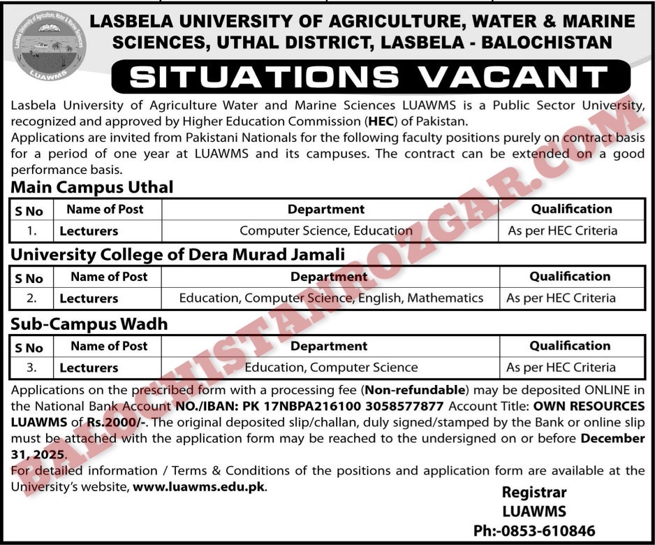 Lasbela University LUAWMS Lecturer Jobs 2026 Full Time NEW