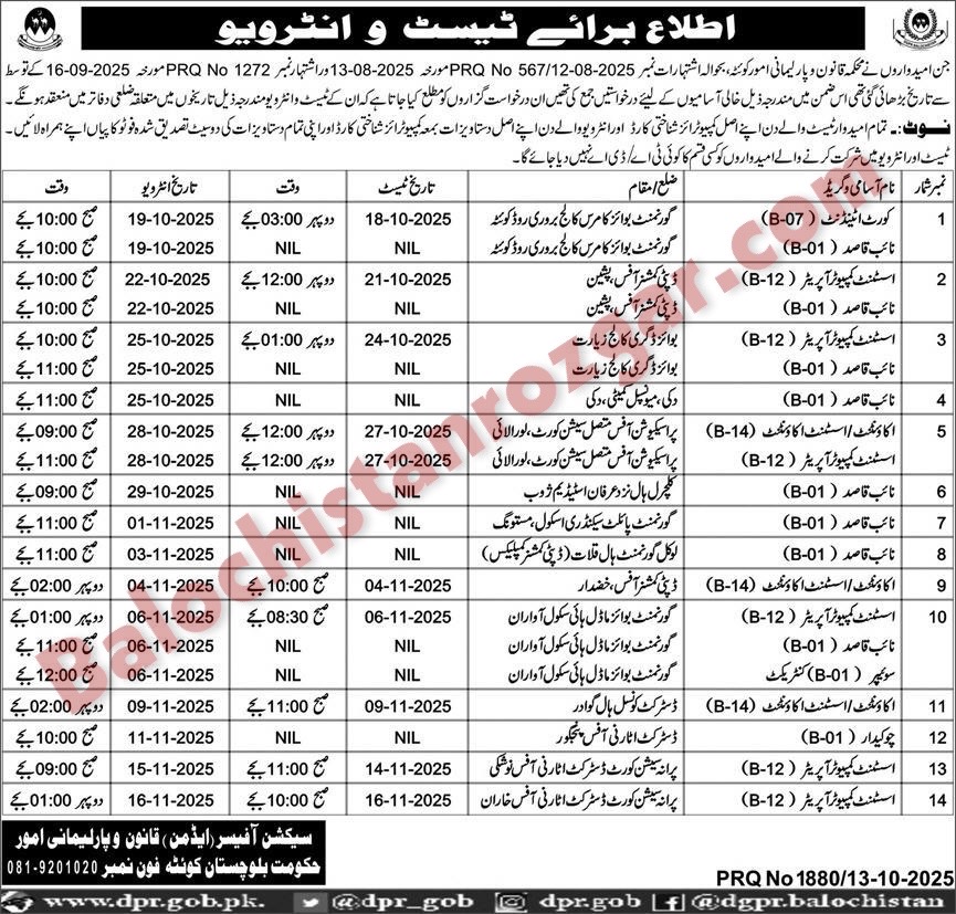 Law and Parliamentary Affairs Balochistan has scheduled Test/Interview for their vacant post which was published in newspaper. Those candidates From Balochistan who applied for these vacant jobs are informed that their Interview Shall be conducted on the following schedule below.