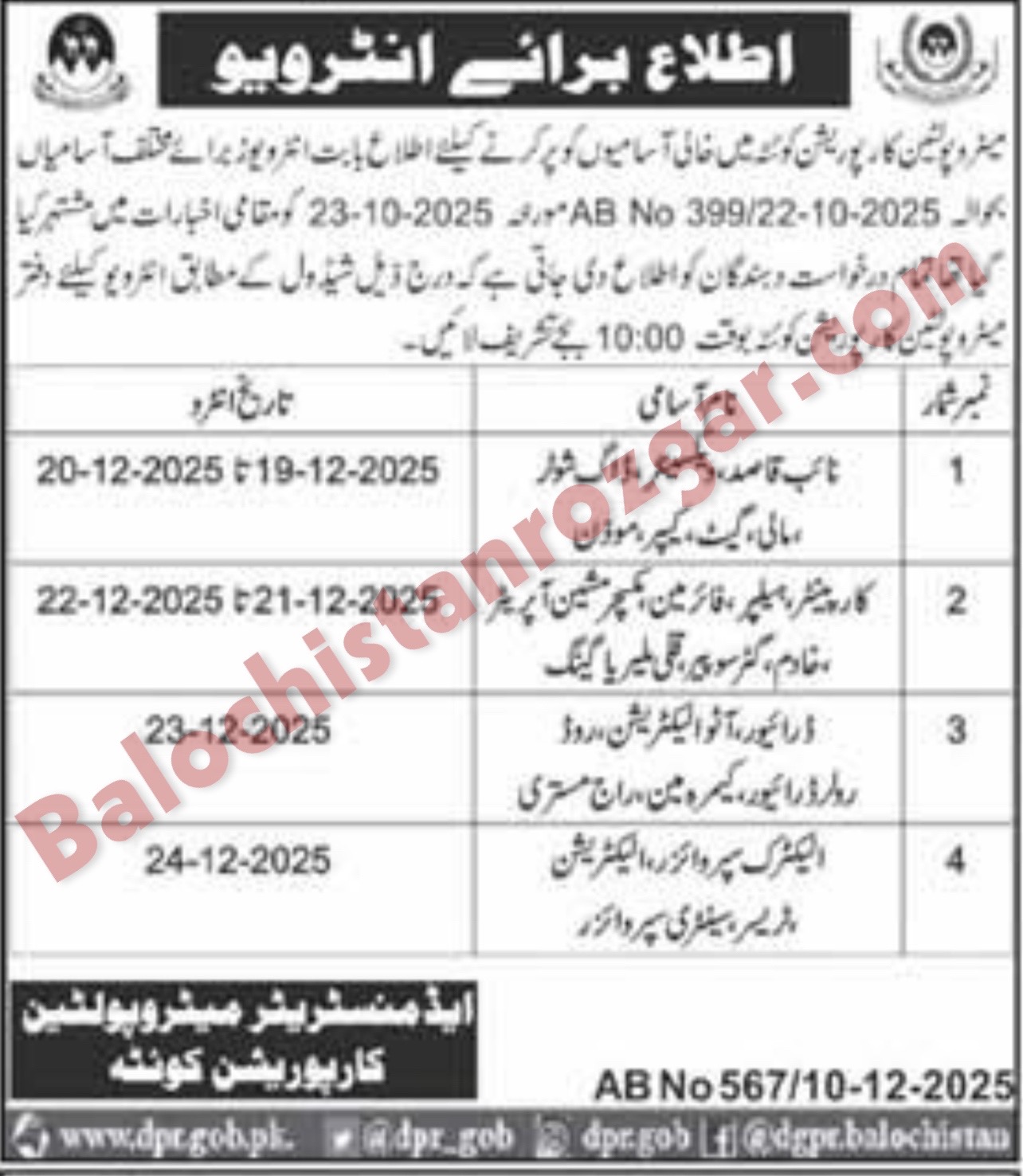Metropolitan Corporation Quettahas scheduled Interview for their vacant post which was published in newspaper. Those candidates From quetta who applied for these Metropolitan Corporation Quetta vacant jobs are informed that their Interview Shall be conducted on the following schedule below.