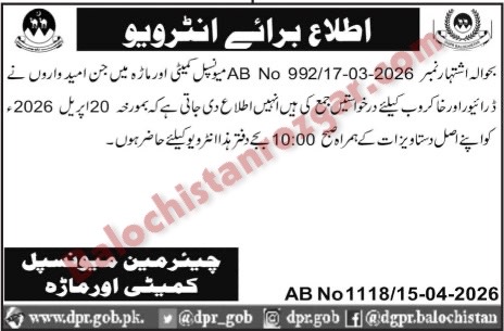 Municipal Corporation MC Ormara has scheduled Interview for their vacant post which was published in newspaper. Those candidates From ormara who applied for these Municipal Corporation MC Ormara vacant jobs are informed that their Interview Shall be conducted on the following schedule below.