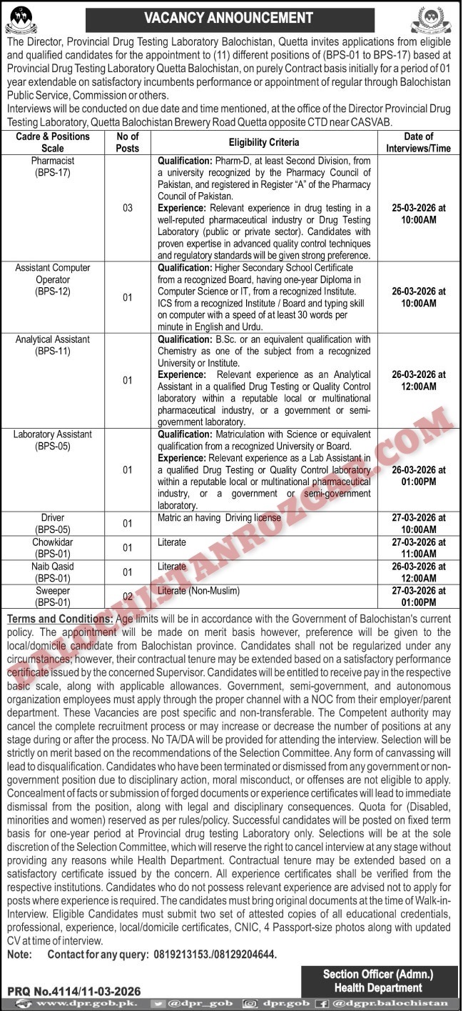 The deadline to submit applications for Provincial Drug Testing Laboratory Balochistan Jobs 2026 is 25 March2026. It is important to apply before this date, as no applications will be accepted after the deadline. Any applications received after this date will be rejected, so be sure to submit yours on time! Don’t miss out on this opportunity.