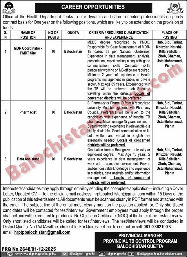 The deadline to submit applications for Provincial TB Control Program Balochistan Jobs 2025 is 25 December 2025. It is important to apply before this date, as no applications will be accepted after the deadline. Any applications received after this date will be rejected, so be sure to submit yours on time! Don’t miss out on this opportunity.