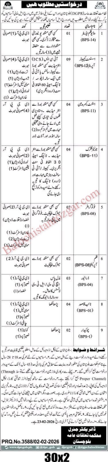 Public Relations Department DGPR Balochistan Jobs 2026 has recently announced job vacancies for Balochistan Locals. These Vacancies were announce in today’s local newspaper. This is an opportunity for candidates of Balochistan Local Domicile holders who seeking employment in Balochistan. Candidates from balochistan can now apply for the following jobs vacant (Candidates who fulfill the criteria can apply) It’s good to read the advertisement first Like Jobs Eligibility Criteria, Current Job Qualification Requirements and Education details for the Post which candidates are willing applying. For the following vacants the Concerned department is inviting applications from the candidates of Balochistan for the following Public Relations Department DGPR Balochistan 2026 jobs. If you meet the eligibility criteria and possess and other skills (if any) then you may apply.