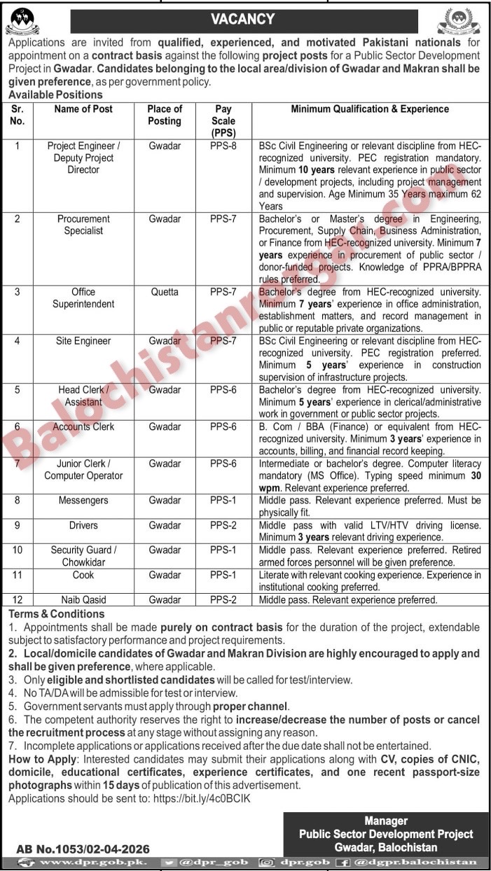The deadline to submit applications for Public Sector Development Project Balochistan Jobs 2026 is 17 April 2026. It is important to apply before this date, as no applications will be accepted after the deadline. Any applications received after this date will be rejected, so be sure to submit yours on time! Don’t miss out on this opportunity.