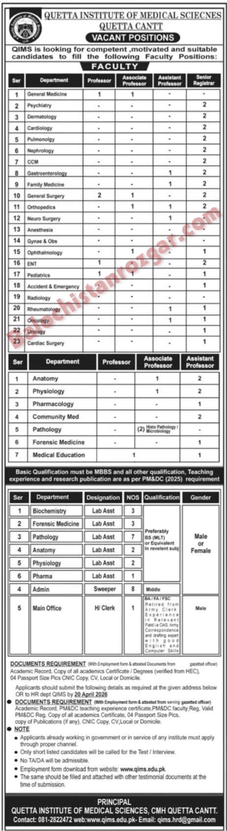 The deadline to submit applications for QIMS Balochistan Jobs 2026 is 20 April 2026. It is important to apply before this date, as no applications will be accepted after the deadline. Any applications received after this date will be rejected, so be sure to submit yours on time! Don’t miss out on this opportunity.
