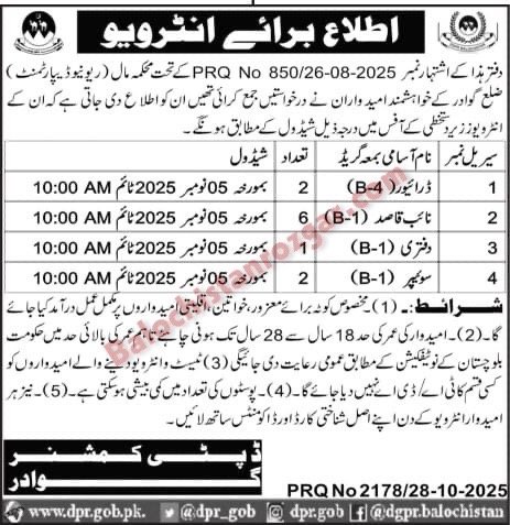 Revenue department Gwadar has scheduled Interview for their vacant post which was published in newspaper. Those candidates From Gwadar who applied for these Revenue department Gwadar jobs are informed that their Interview Shall be conducted on the following schedule below.