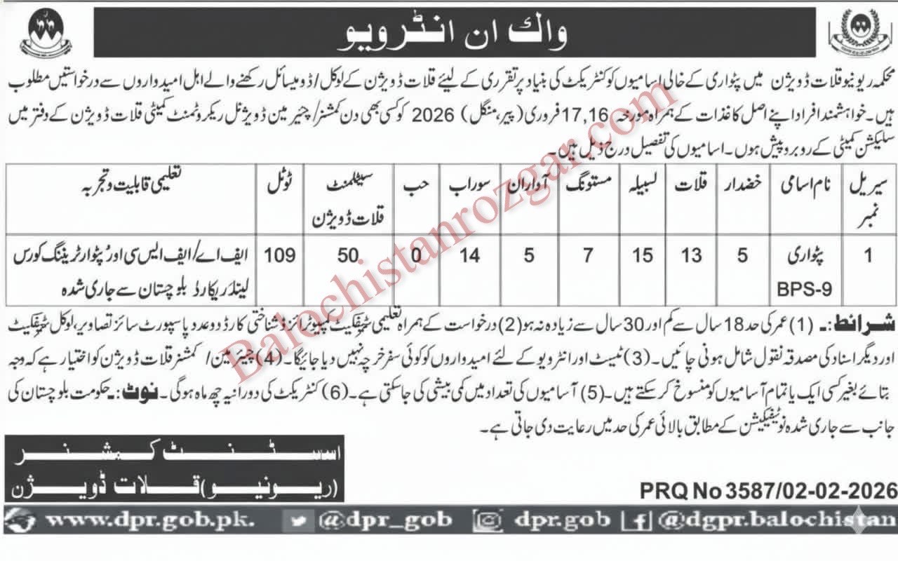The Walk In Test and Interview for Revenue Department Kalat Division Jobs 2026 is 17 Feb 20v26. .