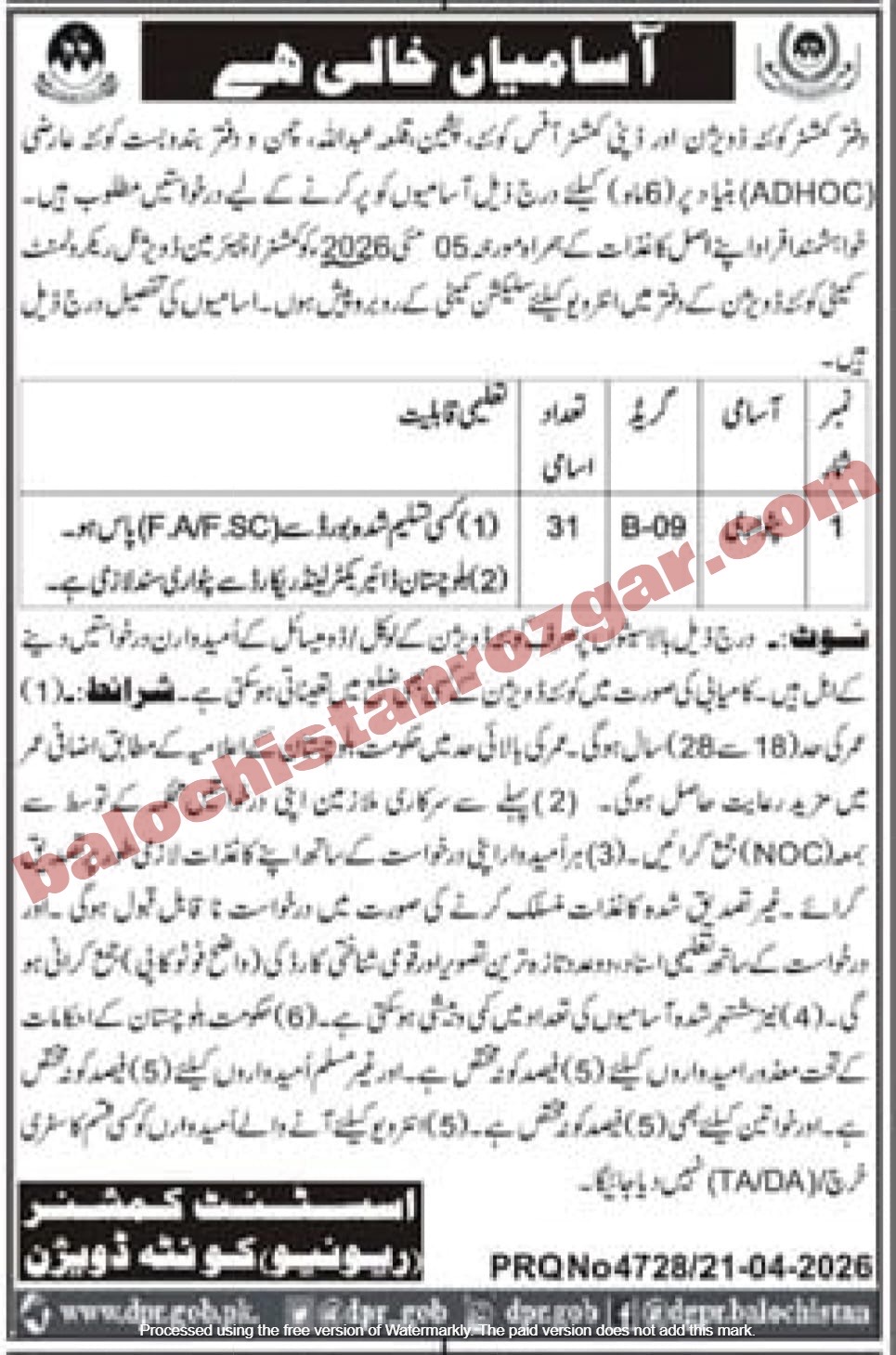 The last date for Revenue Department Quetta Division Jobs 2026 is 05 may 20v26. .