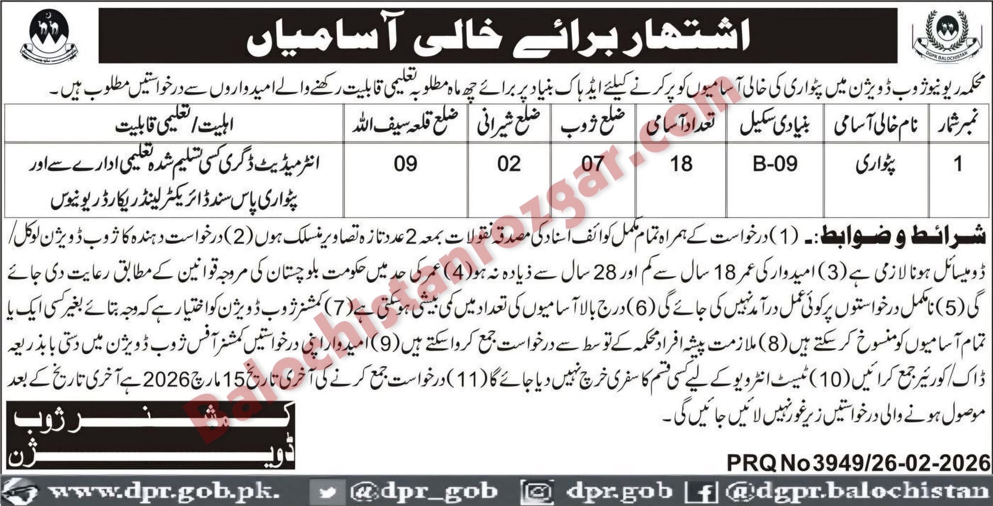 The last date for Revenue Department zhob Division Jobs 2026 is 15 March 20v26. .