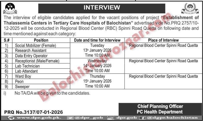 Thalassemia Centers in Tertiary Care Hospitals Balochistan has scheduled Interview for their vacant post which was published in newspaper. Those candidates From Balochistan who applied for these Thalassemia Centers in Tertiary Care Hospitals Balochistan vacant jobs are informed that their Test and Interview Shall be conducted on the following schedule below.