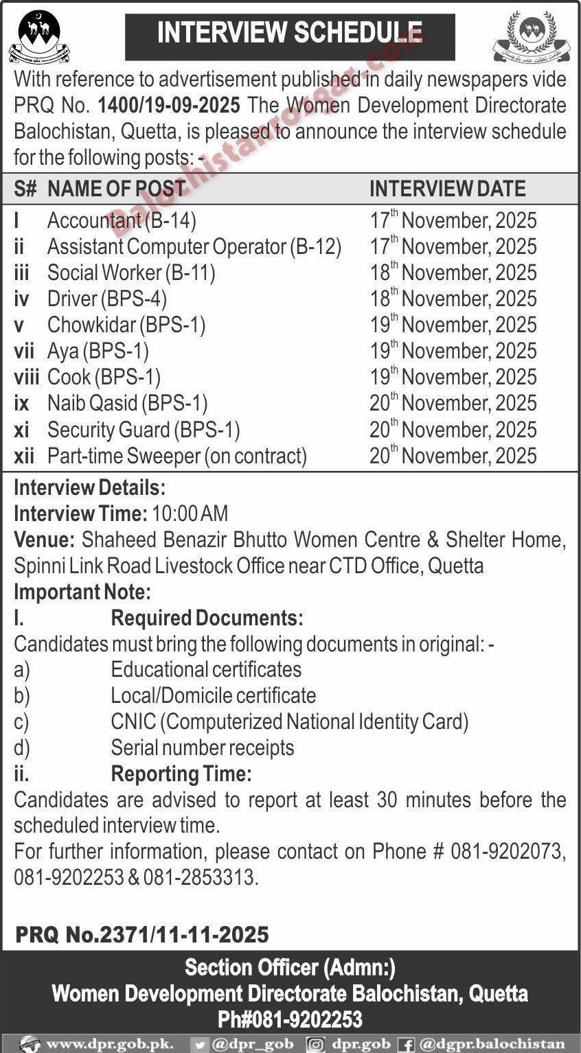Women Development Department Balochistan has scheduled Interview for their vacant post which was published in newspaper. Those candidates From Balochistan who applied for these vacant jobs are informed that their Interview Shall be conducted on the following schedule below.
